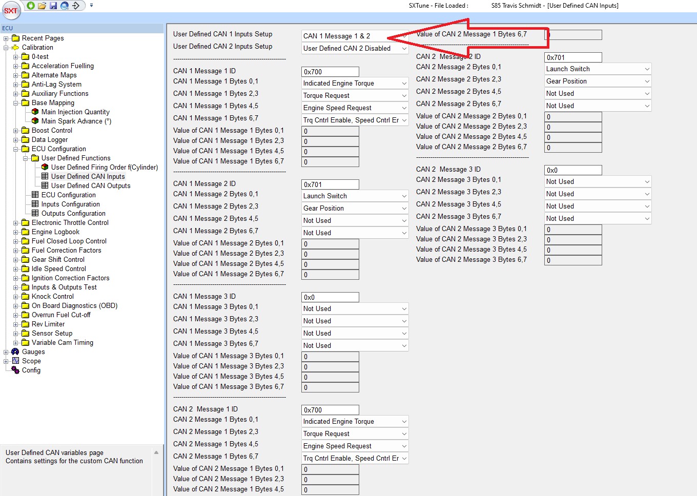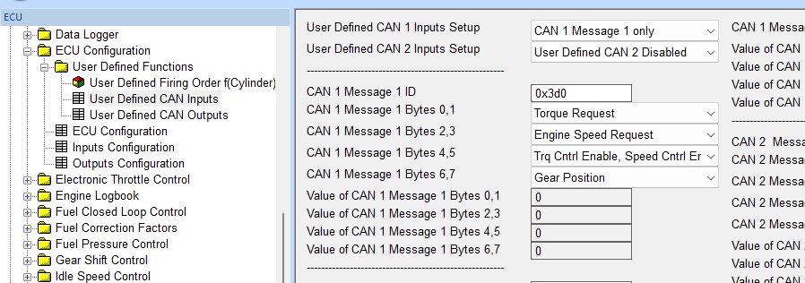 User defined CAN Inputs settings as below. Note that CAN 1 is selected, change to CAN 2 if required depending on which ECU CAN bus the CANTCU GCU is connected to.