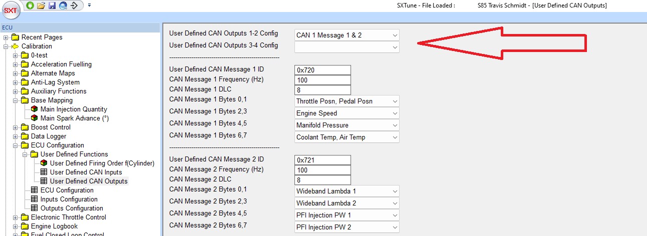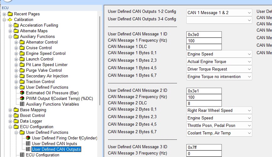 User defined CAN output settings as below. Note that CAN 1 is selected, change to CAN 2 if required depending on which ECU CAN bus the CANTCU GCU is connected to.