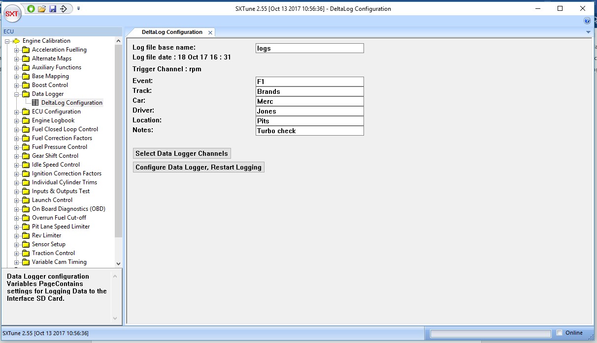 1. Install the latest version of SXTune. Make sure you are logged in as administrator and have the latest windows updates installed before installing SXTune. Connect the logger to a USB port on your computer (you do not need an ECU connected). Open SXTune and in the menu, on the left, open the Engine Calibration group and then choose the Data Logger sub menu, double clicking DeltaLog Configuration.