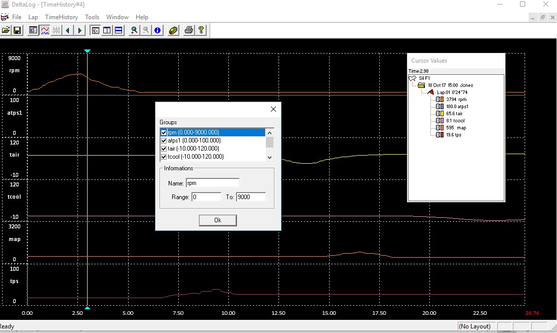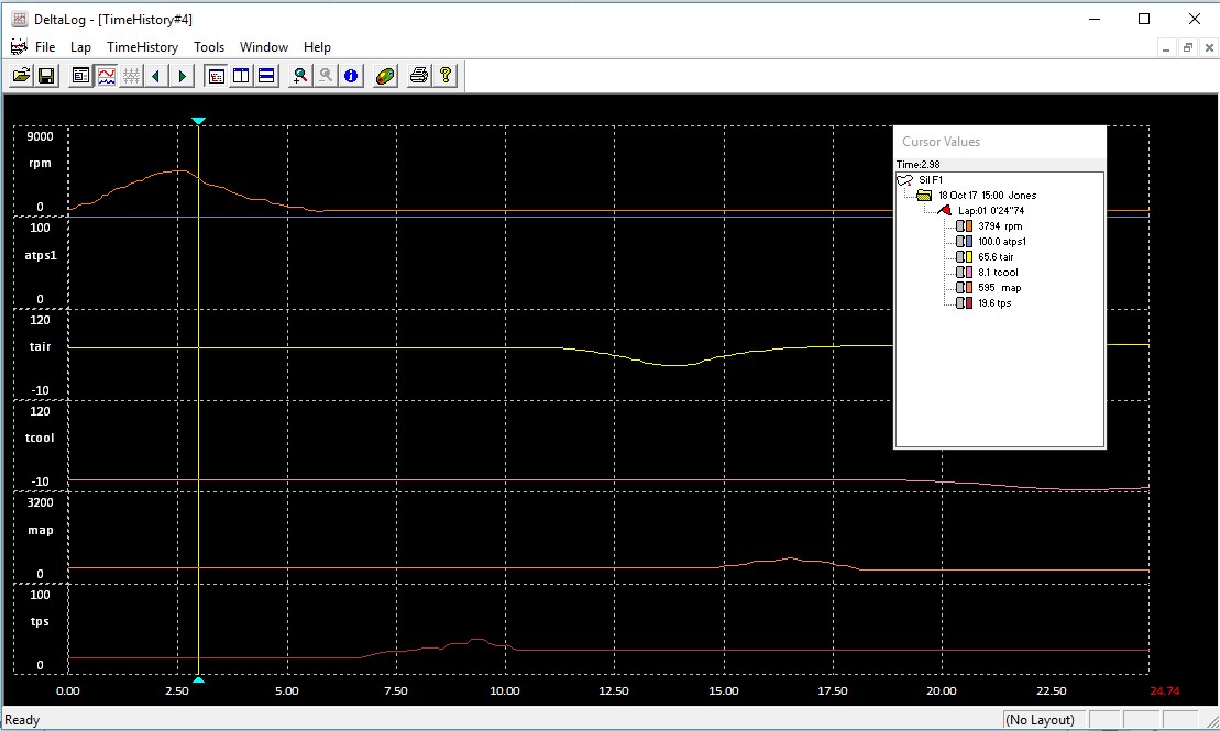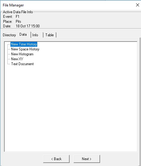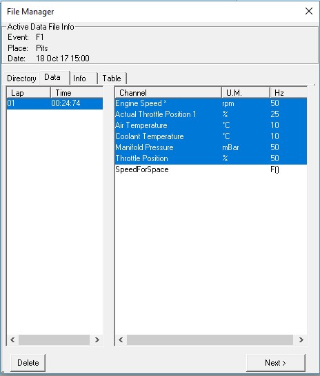The view will change to the Data tab where the lap can be chosen (usually 1) and the channels of interest highlighted (in blue).