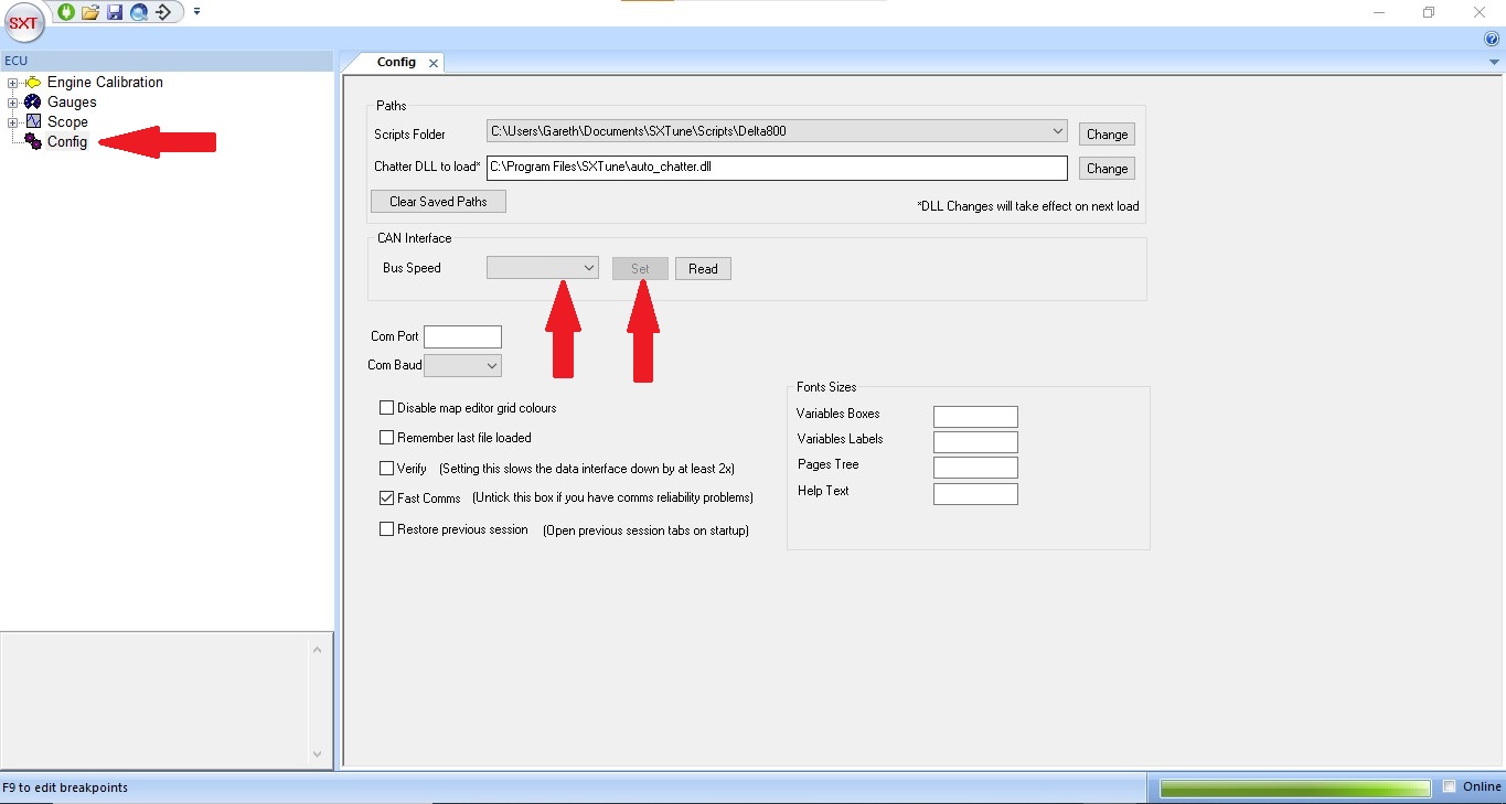 To check possibility 2, first reboot the CAN interface as detailed above, open SXTune and then plug in the interface. Go to config, the last option on the left hand menu, and choose 1Mbit/s in the CAN interface bus speed dropdown. Press set, to set the interface to this speed. You can check that the bus speed has been set properly, by choosing a different speed from the drop-down BUT NOT PRESSING set. If you now press read, then the speed you just set should be read back into the bus speed field. Unplug the cable from the computer and plug the other side of the interface into the engine loom's DB9 connector. With the ECU on and its bus speed set to the same speed you just set the CAN interface to, the red LED should now flash. If the red LED does not flash then try resetting the CAN interface bus speed to 500kb/s and 250kb/s. With the red light flashing you should now be able to plug in the computer cable and connect to the ECU with SXTune