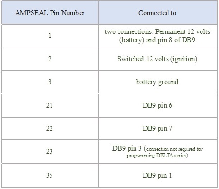 A dedicated programming lead incorporating a switch (to simulate the ignition switch) and a 12 volt mains adapter can be used, as supplied by SCS. Alternatively, the programming lead can be wired using the car’s 12-volt supply and 12-volt switched ignition. The required connections for the D-SUB 9 way female connector and the AMPSEAL 35 female connector (776164-1) are shown in the table and two images below. NOTE: If you connect to the ECU via your vehicle’s OBD port then the D-SUB connector will not be required.