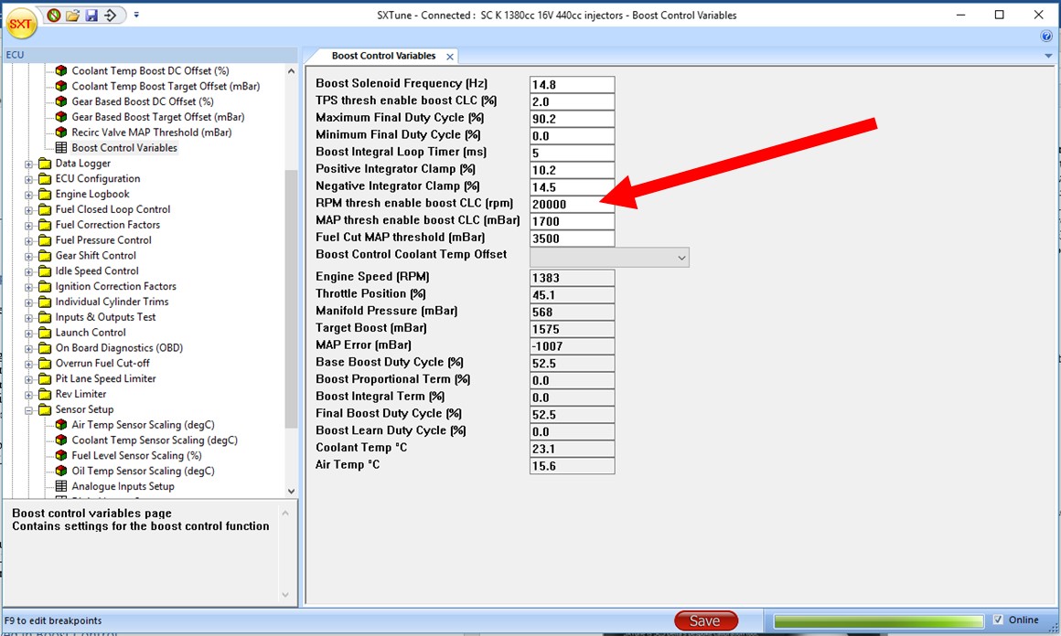 6. When a suitable open loop boost has been obtained, the closed loop control can be reenabled by returning the RPM thresh enable boost CLC to its previous value. The fuel cut MAP threshold should also be set to a safe value for your application.