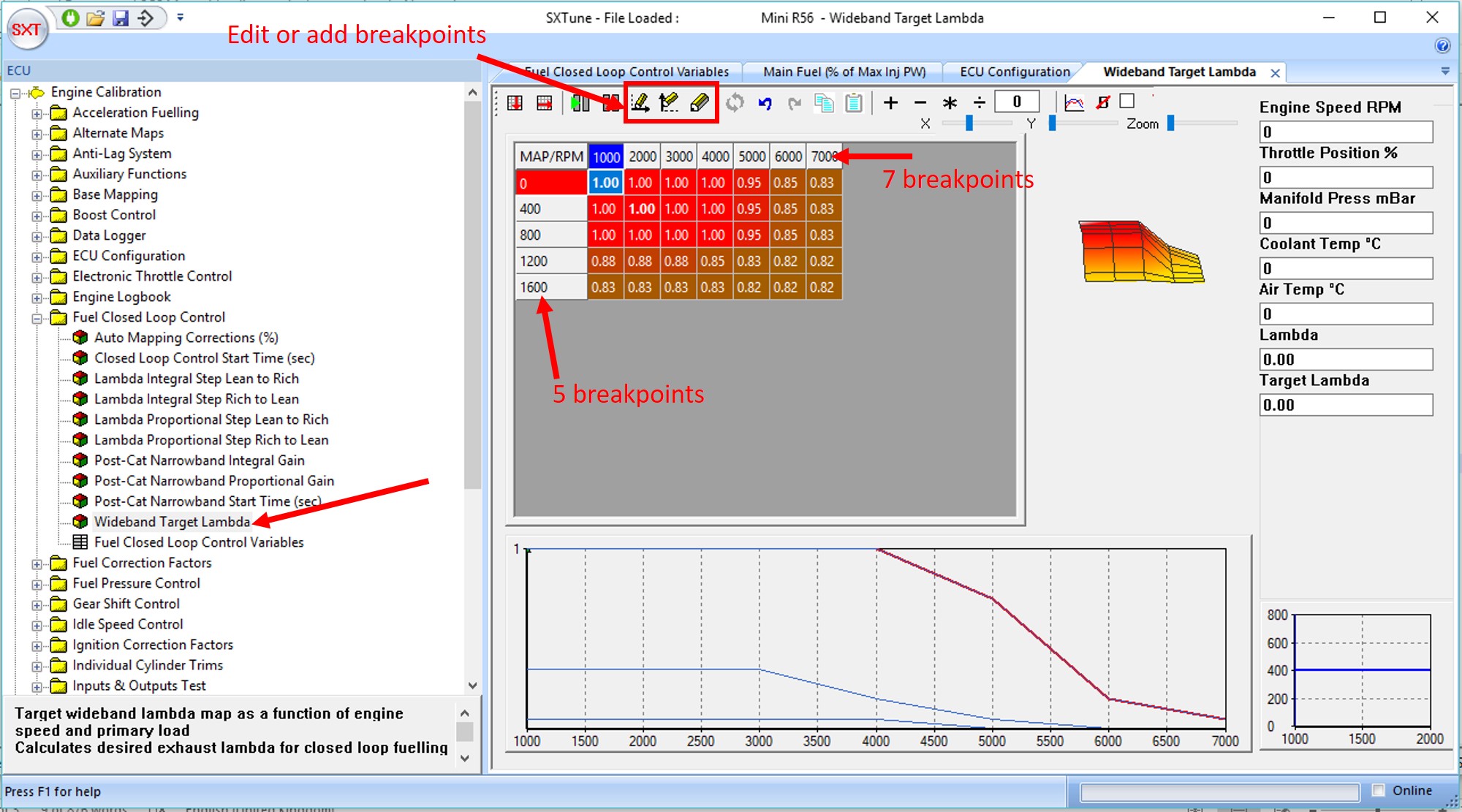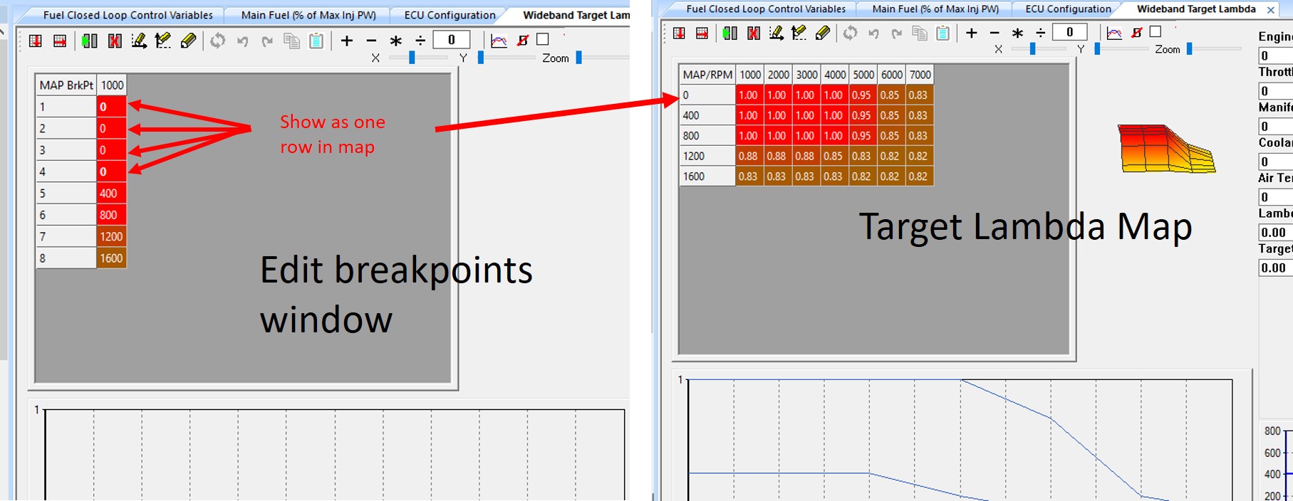 To set up the graph axis more breakpoints (rows or columns) can be added (up to a maximum of 8) using the edit icons. The windows provide for a maximum of 8 breakpoints on each axis. If less than 8 breakpoints are required on either axis, then the lowest breakpoint values can be repeated as shown in the MAP breakpoints edit window shown below. Notice that there are 5 unique values (breakpoints 1 to 4 have the same value) on the x axis (load) giving the 5 rows on the Wideband Target Lambda map. Return to the map view by pressing the pencil icon.