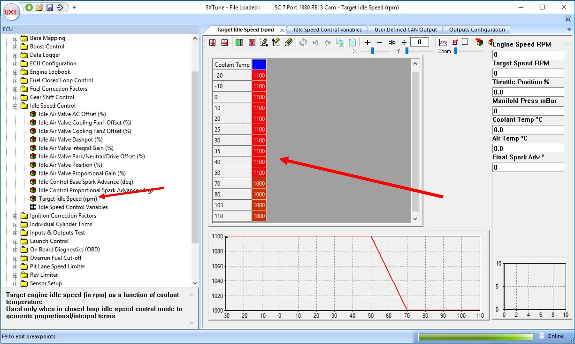 This guide is for customers using closed loop idle control, with a cable operated throttle body, without an idle air control valve (IAC). Since air cannot be adjusted by the ECU with this configuration, spark advance is used to raise or reduce idle speed as necessary. As with any closed loop control system, the base setup should be set reasonably close (a little above) to the desired idle speed. In cases where the vehicle has multiple throttle bodies, extra steps are required in order to reach an even idle. The idle setup for these types of applications is an iterative process where each adjustment can affect previous adjustments. The car should first be warmed to its normal operating temperature before the setup procedure is begun. The TPS should be calibrated according to the procedure detailed in the Configuring Input Sensors section of this manual (see TPS(Cable Throttle) for details). The procedure detailed below should be followed in order to complete setup.