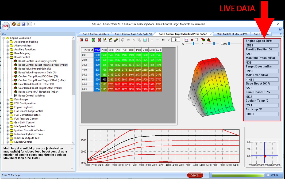 4. Live data is shown in the fields on the right of the page. If you don’t already know it, the value of the wastegate actuator spring (in terms of manifold pressure) can be now determined by increasing RPM and observing the maximum MAP value. This value can be set as the minimum target boost if necessary, but should already be correct (normally 1500 mBar e.g. 500 mBar boost pressure before the actuator spring opens the wastegate).