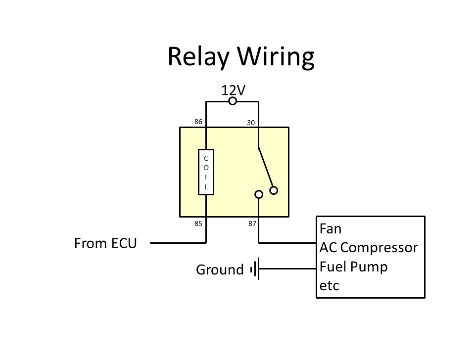 These are Low Side outputs so they controll the negative side of the device. A relay would be wired with a fused feed to the possitive (Pin 86) and the ecu to the negative side (Pin 85) as pictured